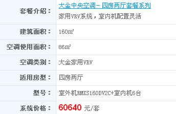 以上的中央空调一拖六套餐价格不仅包括中央空调设备费,而且还包括有配件、辅材以及前期定位、设计、安装、售后等服务费。通过上面的套餐可以看出中央空调品牌不同,所用的系统不同,即使是相同的房型,空调的价格也会有很大的差异,更多中央空调一拖六价格请参考本站家用中央空调套餐页面。